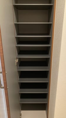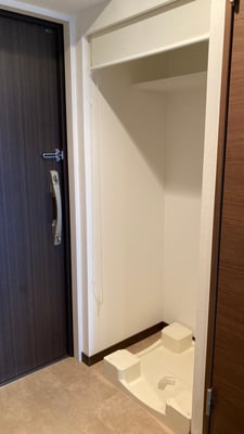 玄関には洗濯機置き場もあり、その上には収納棚も。